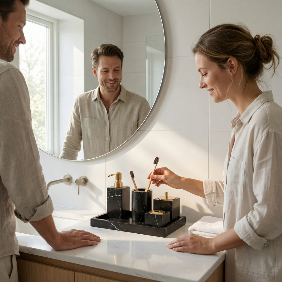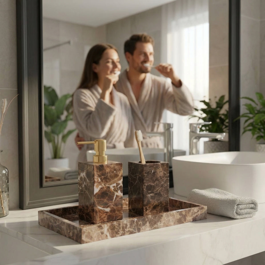 Our marble bathroom sets are designed to bring a sense of calm and refinement into everyday rituals. Crafted from natural stone, each piece showcases unique patterns and textures, making every set one of a kind.